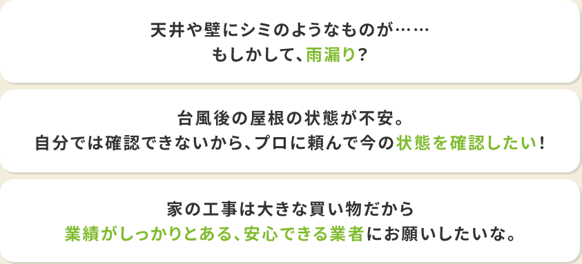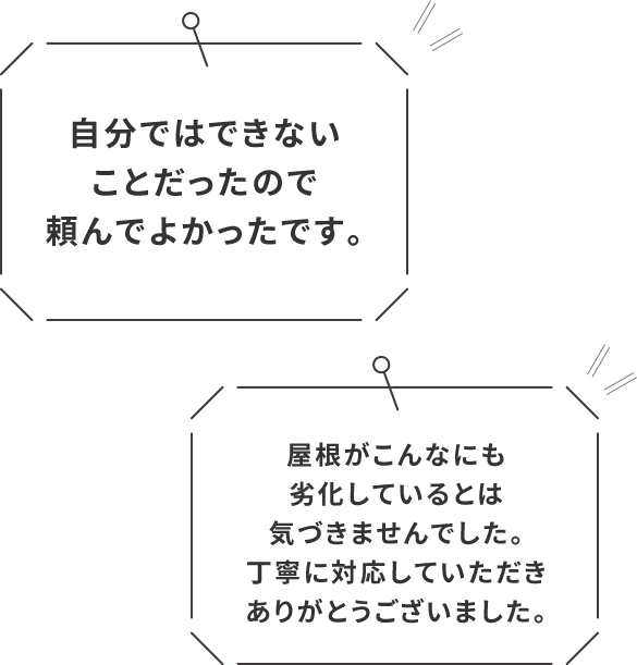 「雨漏りが発生した」 「屋根が剥がれてきた」などの緊急性の高い現場では、一刻も早い処置が必要です。 当方では最短でその日にお伺いし、できる限りの処置を行うよう努めております。
